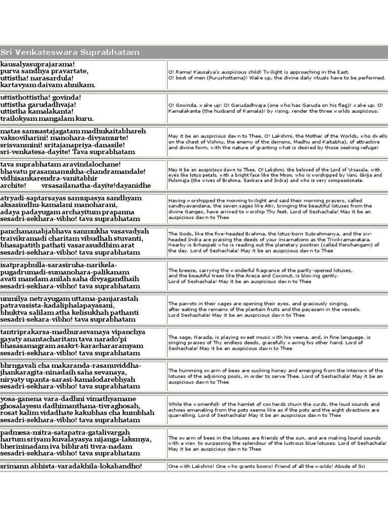 Venkateswara Suprabhatam Lyrics And Meaning Venkatesa Suprabhatam Lyrics Meaning In English Sri Venkatesa Suprapatham Suprapatham With English Translation And Meaning Suprapatha Slokha Meaning - Suprabhatam is a collection of hymns or verses recited early morning to awaken the deity in hinduism.